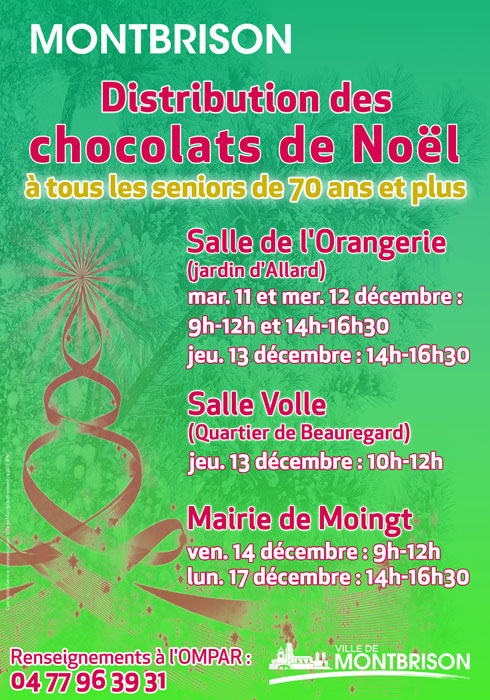 En cette période de fêtes de fin d’année, la Ville de Montbrison organise une distribution de chocolats pour toutes les personnes âgées de 70 ans et plus, qui habitent sur la commune.