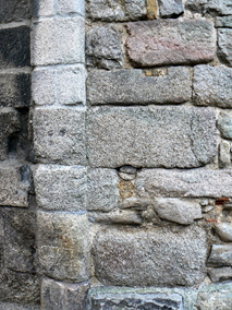 Cependant les restes de remparts qui subsistent dans le bâti ou les caves des maisons voisines laissent envisager une construction différente pour le reste de l’enceinte. L’appareillage en est plus irrégulier. Il peut s’agir d’une première enceinte difficile à dater ou d’une autre forme d’enceinte dont le mur moins soigné était adossé à un talus qui en masquait les imperfections.