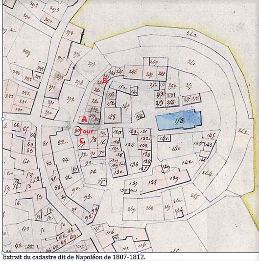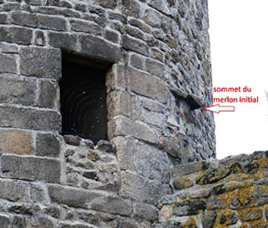 La tour fut surélevée une première fois d’environ trois mètres et la partie haute des remparts a reçu des meurtrières (Lettre C du plan cadastral napoléonien et photo ci-dessous). Le rempart a été modifié au moment où l’artillerie a fait son apparition c’est ainsi que les sondages ont révélé la présence d’une tour ouverte. (Lettre B du cadastre napoléonien).