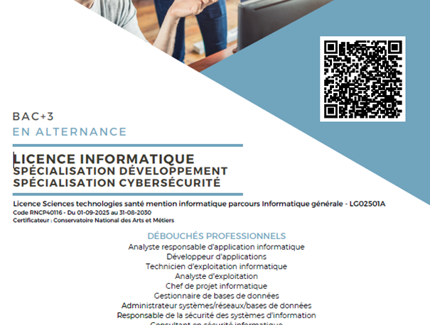 Envie de poursuivre vos études à Montbrison ? C'est possible avec le Cnam ! Découvrez le nouveau parcours d'études supérieures en Informatique La Licence Informatique spécialisation Développement web ou Cybersécurité Diplôme d’État Bac+3… lire la suite >
