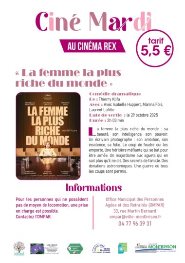 L’Office Municipal des Personnes Âgées et des Retraités vous invite à une nouvelle séance Ciné Mardi au cinéma Rex avec la comédie dramatique « La femme la plus riche du monde », avec Isabelle Huppert.