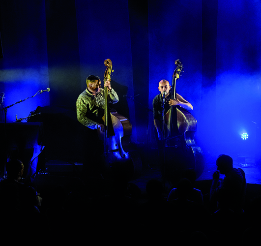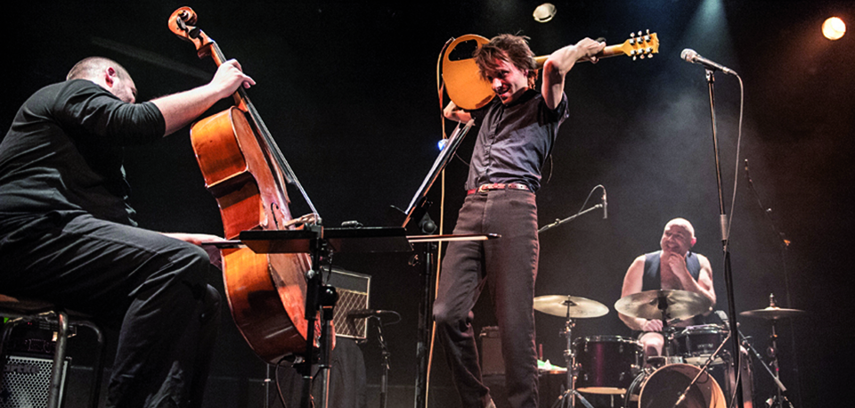 Sur scène il se présente en duo de contrebasse avec Stephen Harrison, slapeur surréaliste qui peut aussi bien jouer du banjo que du peigne.