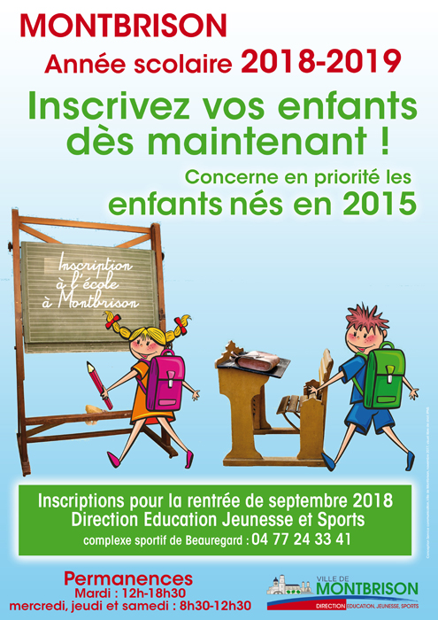 Les familles résidentes ou nouveaux arrivants sur la Ville de Montbrison sont invitées à venir effectuer l’inscription scolaire des enfants maternels pour la rentrée 2018-2019, le plus rapidement possible auprès de la Direction Education jeunesses et Sports de la Ville.