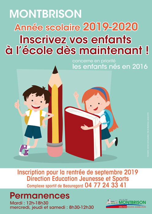Les familles résidentes ou nouveaux arrivants sur la Ville de Montbrison sont invitées à venir effectuer l’inscription scolaire des enfants maternels pour la rentrée 2019-2020, le plus rapidement possible auprès de la Direction Education jeunesses et Sports de la Ville.