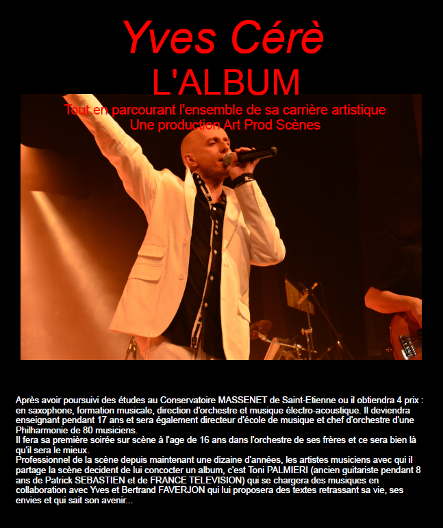 Dans le cadre des « Jeudis de l’été », ce 18 Août, le Comité des Fêtes vous offre au Jardin d’Allard, à partir de 21H une soirée spéciale au cours de laquelle Yves Cérè présentera son nouvel album. Les artistes musiciens, avec qui ce professionnel partage la scène, depuis maintenant une dizaine d’année, ont décidé de lui concocter un album. C’est Toni PALMIERI (ancien guitariste pendant 8 ans de Patrick Sébastien et de France Télévisions) qui se chargera des musiques en collaboration avec Yves et Bertrand FAVERJON qui lui proposeront des textes retraçant sa vie, ses envies et qui sait son avenir…