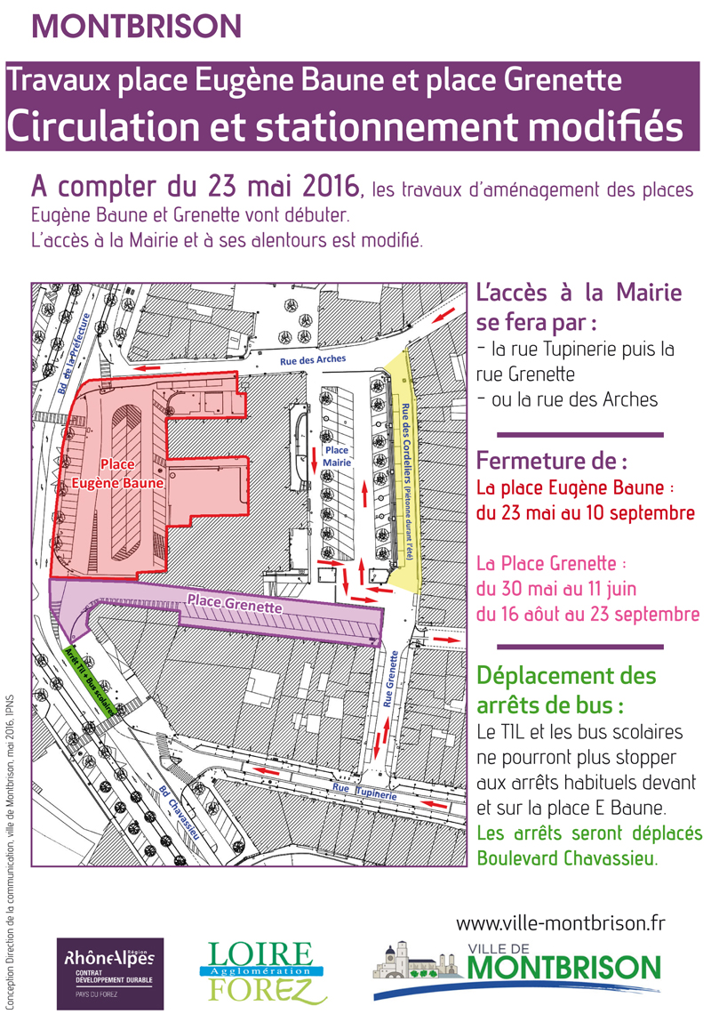 Les travaux d’aménagement des places Eugène Baune et Grenette ont débuté le 23 mai. Ils vont durer quatre mois pour la réorganisation des espaces situés à proximité de la future médiathèque Loire Forez dont l’ouverture est prévue en septembre.