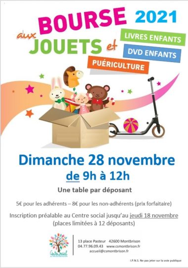 Bourse aux jouets (livres enfants, DVD enfants, puériculture) le dimanche 28 novembre de 9h à 12h.
