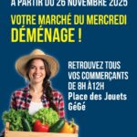 À partir du 26 novembre 2025, retrouvez tous vos commerçants de 8h à 12h à la Place des Jouets GéGé, sous la halle, à seulement 250 mètres de l’emplacement habituel.